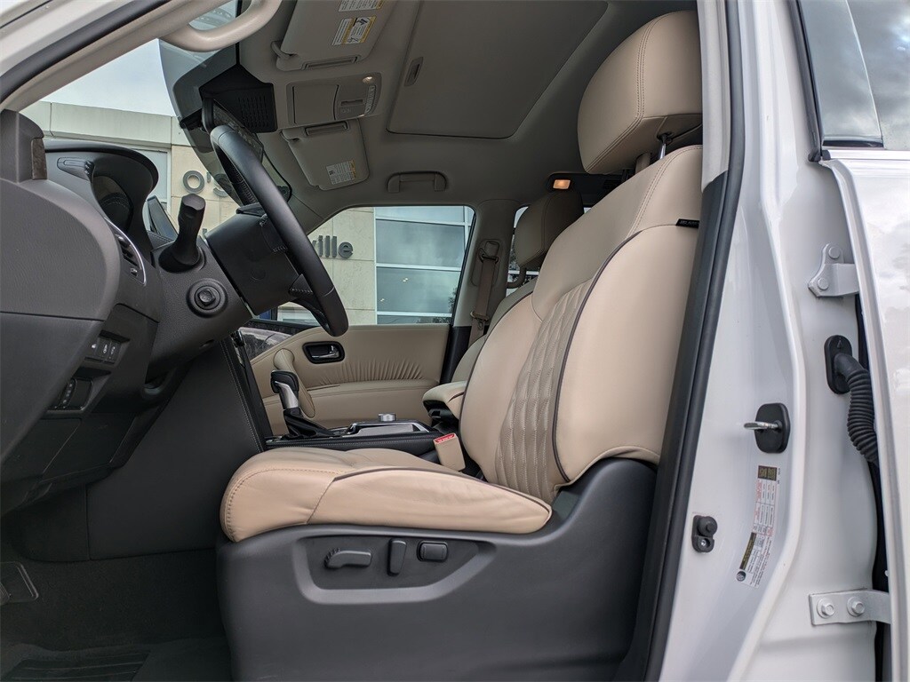 2021 Nissan Armada Platinum Armada Platinum, 5.6L V8 DOHC 32V LEV3-ULEV125 400hp, 7-Speed Automatic, Aspen White Tricoat, Almond w/Quilted Leather Seat Trim, 2nd Row Captain's Chairs, 2nd Row Center Console w/Padded Armrest, Captain's Chairs Package, 13 Speakers, 2.94 Axle Ratio, 3rd Row Carpeted Floor Mats - Captain Seat, 3rd row seats: split-bench, 4-Wheel Disc Brakes, A/V remote, ABS brakes, Air Conditioning, Alloy wheels, AM/FM radio: SiriusXM, Anti-whiplash front head restraints, Auto High-beam Headlights, Auto tilt-away steering wheel, Auto-dimming door mirrors, Auto-dimming Rear-View mirror, Auto-leveling suspension, Automatic temperature control, Brake assist, Bumpers: body-color, Climate-Controlled Front Bucket Seats, Delay-off headlights, Driver door bin, Driver vanity mirror, Dual front impact airbags, Dual front side impact airbags, Electronic Stability Control, Emergency communication system: NissanConnect Services, Exterior Parking Camera Rear, Four wheel independent suspension, Front anti-roll bar, Front Bucket Seats, Front Center Armrest, Front dual zone A/C, Front fog lights, Front reading lights, Fully automatic headlights, Garage door transmitter: HomeLink, Headphones, Heated door mirrors, Heated front seats, Heated rear seats, Heated steering wheel, Illuminated entry, Illuminated Kick Plates, Illuminated Scuff Plate, Leather Shift Knob, Low tire pressure warning, Memory seat, Navigation System, NissanConnect featuring Apple CarPlay and Android Auto, Occupant sensing airbag, Outside temperature display, Overhead airbag, Overhead console, Panic alarm, Passenger door bin, Passenger vanity mirror, Power door mirrors, Power driver seat, Power Liftgate, Power moonroof, Power passenger seat, Power steering, Power windows, Quilted Leather Seat Trim, Radio: NissanConnect w/SiriusXM, Rain sensing wipers, Rear air conditioning, Rear anti-roll bar, Rear reading lights, Rear seat center armrest, Rear window defroster, Rear window wiper, Reclining 3rd row seat, Remote keyless entry, Security system, Special Paint - Aspen White, Speed control, Speed-sensing steering, Speed-Sensitive Wipers, Split folding rear seat, Spoiler, Steering wheel memory, Steering wheel mounted audio controls, Tachometer, Telescoping steering wheel, Tilt steering wheel, Traction control, Trip computer, Turn signal indicator mirrors, Variably intermittent wipers, Ventilated front seats, Voltmeter, Welcome Lighting, Wheels: 22" Machine-Faced w/Tinted Clear Coat, NAVIGATION, NON SMOKE, LOCAL TRADE, Armada Platinum, 5.6L V8 DOHC 32V LEV3-ULEV125 400hp, 7-Speed Automatic, Aspen White Tricoat, Almond w/Quilted Leather Seat Trim, 2nd Row Captain's Chairs, 2nd Row Center Console w/Padded Armrest, Captain's Chairs Package.