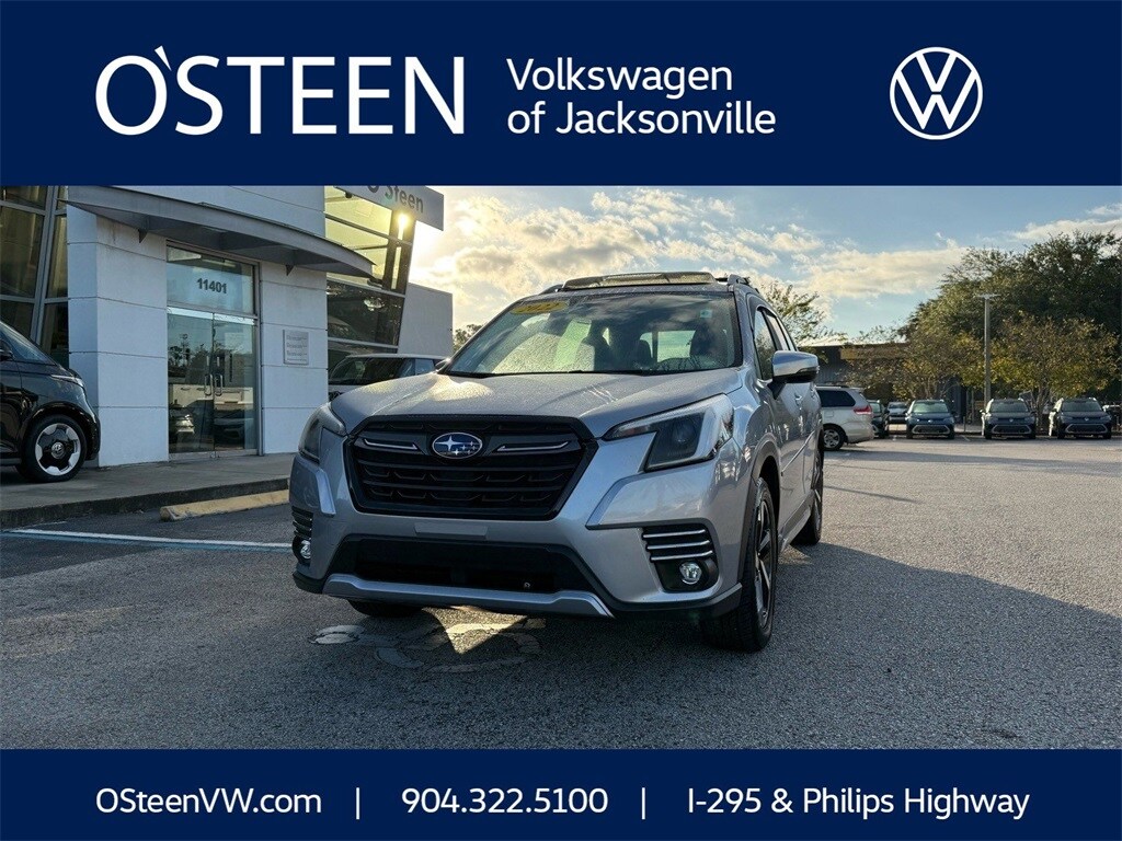 2022 Subaru Forester Touring Forester Touring, AWD, Ice Silver Metallic, Black w/Perforated Leather-Trimmed Upholstery, 9 Speakers, Air Conditioning, AM/FM radio: SiriusXM, Automatic temperature control, Brake assist, CD player, Driver door bin, Driver vanity mirror, Electronic Stability Control, Four wheel independent suspension, Front Bucket Seats, Front Center Armrest, Front dual zone A/C, Front reading lights, harman/kardon 576W Amp & Speaker System, harman/kardon® Speakers, Heated Front Bucket Seats, Heated front seats, Heated rear seats, Heated steering wheel, HVAC memory, Illuminated entry, Leather Shift Knob, Memory seat, Navigation System, Outside temperature display, Overhead console, Passenger vanity mirror, Perforated Leather-Trimmed Upholstery, Power driver seat, Power Liftgate, Power moonroof: Panoramic, Power passenger seat, Power steering, Power windows, Premium audio system: harman/kardon, Radio data system, Radio: Subaru Starlink 8.0" Multimedia Nav System, Rear seat center armrest, Rear window defroster, Remote keyless entry, Speed-sensing steering, Split folding rear seat, Standard Model, STARLINK/Apple CarPlay/Android Auto, Steering wheel mounted audio controls, Tachometer, Telescoping steering wheel, Tilt steering wheel, Traction control, Trip computer, Wheels: 18" x 7.0J Dark Gray Machine Finish Alloy.